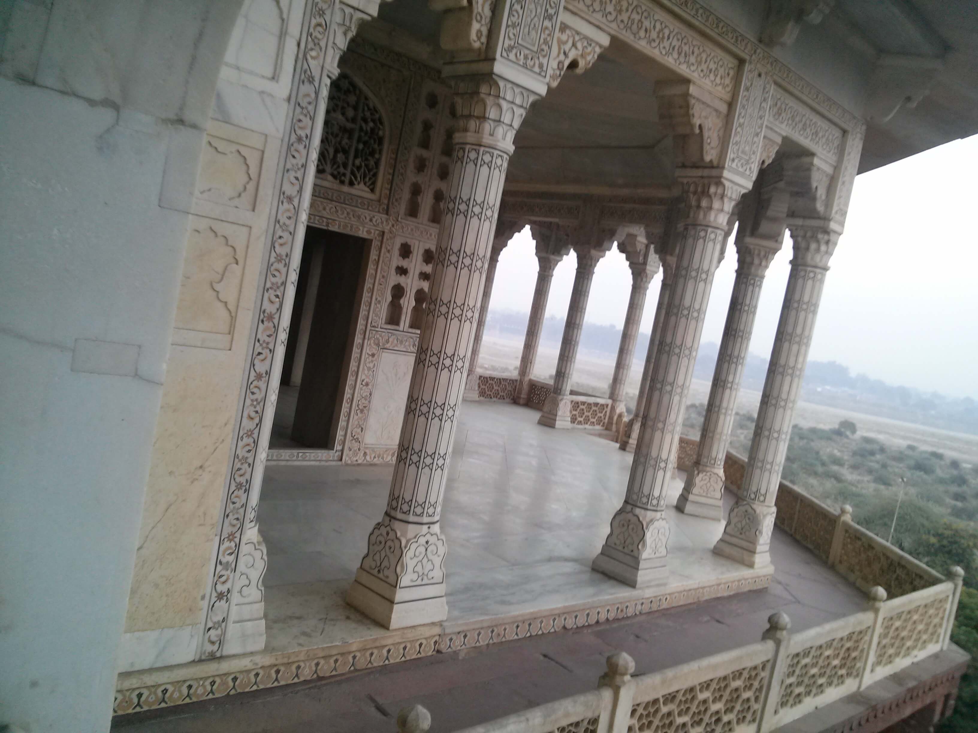 아그라 성의 하얀 대리석 기둥 사이로 보이는 풍경이 참 묘하죠? 처음엔 그저 안개인 줄로만 알았는데, 사진을 정리하며 자세히 보니 저 멀리 하얀 실루엣의 타지마할이 숨어 있더라고요. 🏰🔭